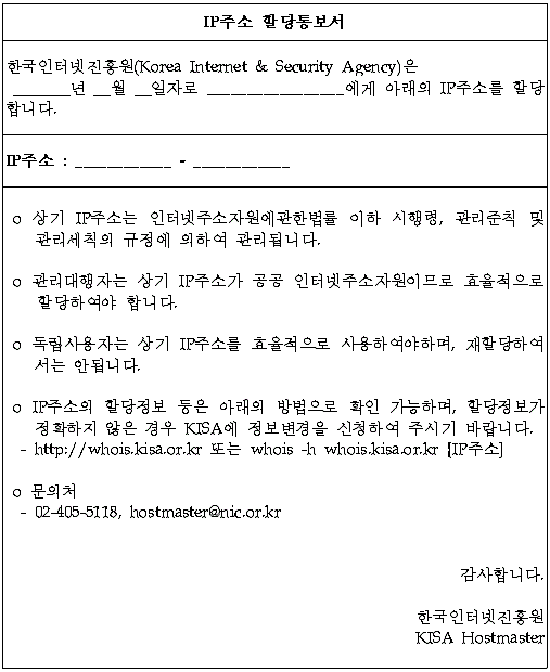- 4. 진흥원은 IP주소를 할당하는 경우 신청인에게 별지 제1호서식에 의해 할당을 통보한다.