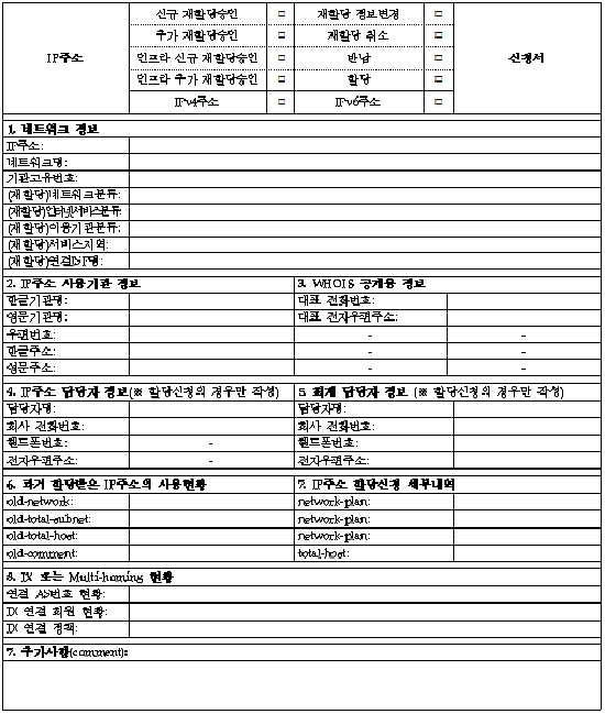 - 1. 관리대행자가 사용자에게 IP주소를 할당하고자 하는 경우 별지 제2호서식에 따라 할당승인신청서를 진흥원에 제출하여야한다.